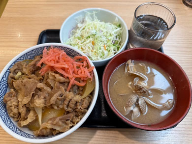 今日は「吉野家」から「牛丼(並)サラダ&味噌汁セット715円+あさり汁に変更132円」です。