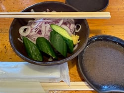 「八刻丸」の温かいきしめんはおつゆがかなりの薄味で幅広モチモチの麺に絡まないので、毎回「おろししょうが」などの薬味を駆使して食べてましたが、冷たいきしめんのおつゆは普通に濃くていい感じでした♪