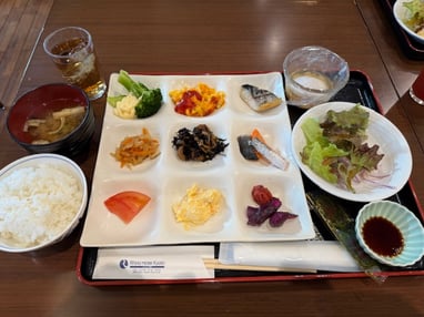 写真は愛知医大内の2Fにある「カフェド・クリエ」の「パストラミポークと彩り野菜のモーニングセット650円」です。