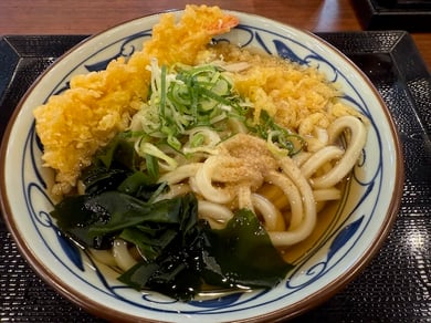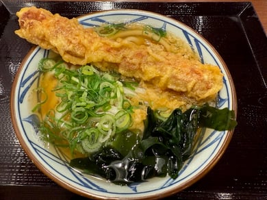 今日は平針の帰りに食べた「丸亀製麺」の新作、「海鮮旨塩うどん(並)920円&いわし天160円」です。