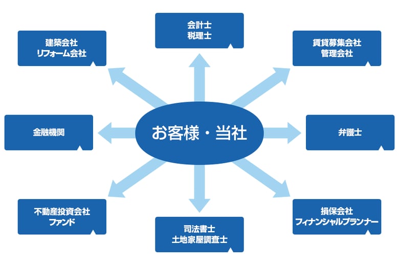 それら1つ1つをお客様と一緒に考え、安定した収入を確保していくために下記の図の様にその分野の専門家と連携して、トータルでオーナー様をバックアップしていきます。